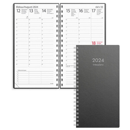 Musta ympäristöystävällinen uusiokartonkikansi. Kalenterin aukeamalla yksi viikko ja kuluvan kuukauden kalenteritaulukko, tuntijaotus 08-20. Kalenteri sisältää nimipäivät, kansalliset pyhäpäivät, liputuspäivät, kuun vaiheet,vuosisuunnitelmat kuluvalle ja seuraavalle vuodelle, vuosiruudukot kuluvalle ja seuraavalle vuodelle, yleiset pyhäpäivät Euroopassa, kalendaariset tiedot, Suomen kartta ja välimatkataulukon. Kalenteriosa: vk 52 2023-vk 1 2025. Kaksikielinen: suomi/ruotsi. Parikierresidottu. FSC®. Koko 83x158 mm.