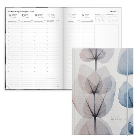 Painettu pellavatekstiilikansi, kuminauhalla. Kalenterin aukeamalla yksi viikko, tuntijaotus 08-20, palsta muistiinpanoille, kuluvan ja seuraavan kuukauden kalenteritaulukot. Kalenteri sisältää nimipäivät, juhlapyhät, liputuspäivät, kuun vaiheet, vuosisuunnitelmat kuluvalle ja seuraavalle vuodelle, vuosiruudukot edelliselle, kuluvalle ja kahdelle seuraavalle vuodelle, kalendaariset tiedot, auringon nousu- ja laskuajat, yleiset pyhäpäivät maailmalla ja muistiinpanosivut. Kalenteriosa: vk 48 2023-vk 1 2025. Kolmikielinen: suomi/ruotsi/englanti. Sidottu. Koko: 148x210 mm (A5).