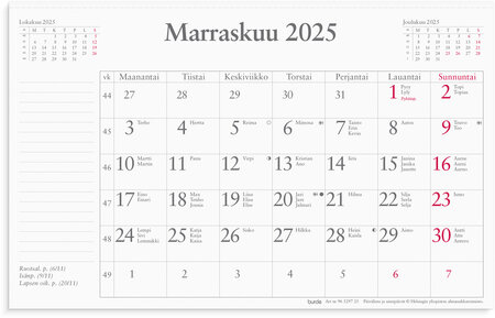 Kalenterin aukeamalla edellisen sekä tulevan kuukauden kalenteritaulukot. Kalenteri sisältää nimipäivät, kuun vaiheet, liputuspäivät ja kansalliset pyhäpäivät. Kalenteriosa: 1 tammikuu 2025-31 joulukuu 2025. Suomenkielinen. FSC®. Koko: 240x152 mm.