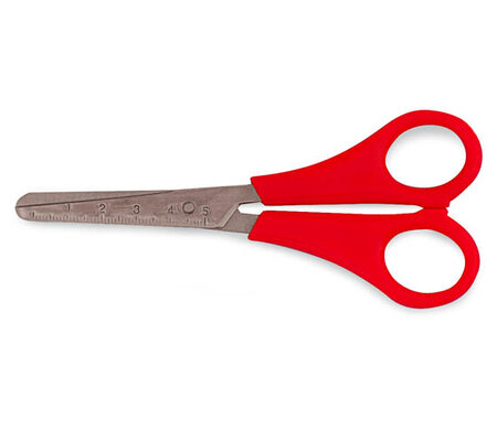 Pyöreäkärkiset lasten-/askartelusakset. Kiinnityskohdassa ruostumaton teräsruuvi. Terä ruostumatonta terästä. Terän pituus n. 5 cm. Kahva kestävästä muovista. Oikea- ja vasenkätisille. Värilajitelma: sakset keltaisia, sinisiä, punaisia ja vihreitä.